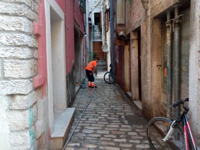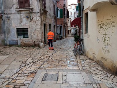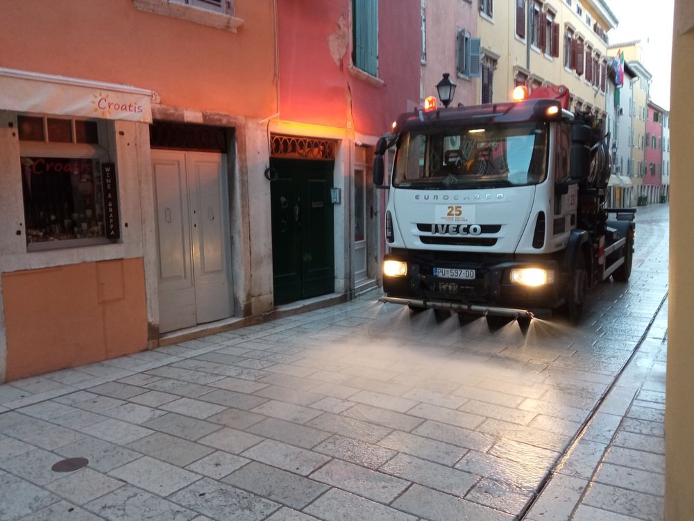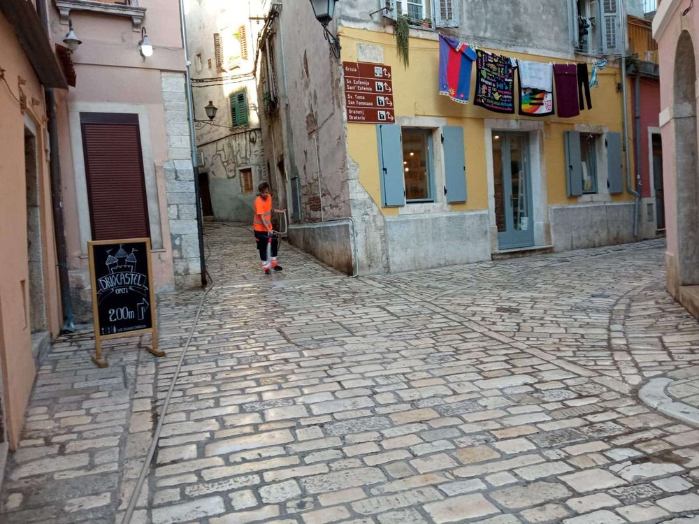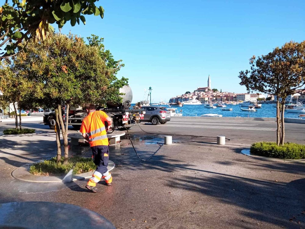 U jeku turističke sezone, djelatnici Čistoće gradskog Komunalnog servisa, u ranim jutarnjim satima peru i čiste gradske površine, trgove, klupe i ulice starogradske jezgre, kako bi svojim građanima i posjetiteljima Rovinja pružili užitak u dnevnim šetnjama gradom.