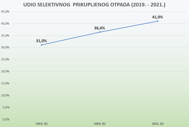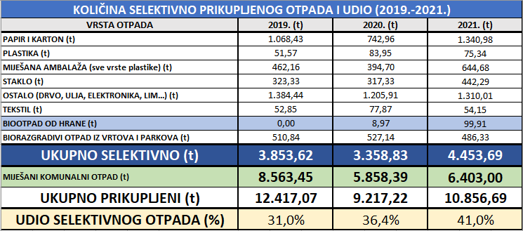 Navedene su količine miješanog komunalnog otpada i biorazgradivog otpada, ukupne količine otpada, te dio selektivnog otpada (papir/karton, plastika, staklo, tekstil, biootpad od hrane, biorazgradivi otpad iz vrtova i parkova i ostale vrste otpada), te udio selektivnog otpada u ukupno prikupljenom komunalnom otpadu.